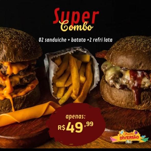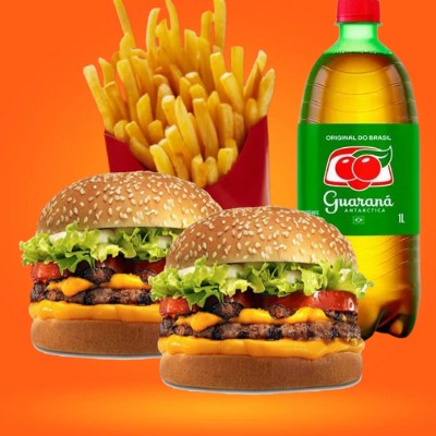 | 2 hamburg (carne bovina artesanal 120 g cada + sheddar +alface e tomate +pao de batata) batata frita como acompanhamento + 1 refri de litro |