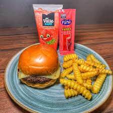 | HAMBURG ARTESANAL BOVINO 120G + QUEIJO CHEDDAR EM DOBRO+ SALADA E TOMATE + BATATA FRITA COMO ACOMPANHAMENTO |